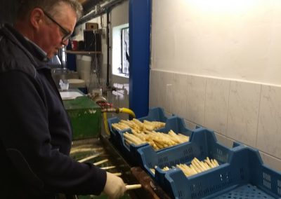 Vervolgens worden de asperges gewassen, op maat gesneden en gesorteerd naar kwaliteit. Bij aspergeboerderij Koks zijn de asperges ook geschild verkrijgbaar.